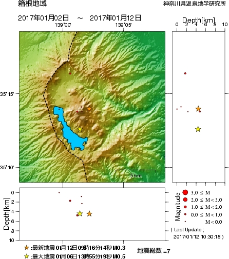 箱根・大涌谷周辺で1月18日から「群発地震」が発生している(J-CASTの記事)。2013年2月10日の13時過ぎにロープウェーが停止し、桃源台駅では「大涌谷で最大震度5を記録しました。」とアナウンスしていたという。地震を観測したのは事実で、約2時間運行を見合わせて安全点検を実施したという。気象庁の観測点では震度1以上の記録は見当たらないが、神奈川県温泉地学研究所の発表によると、大涌谷で13時15分に震度3、マグニチュード2.3、深さ1.5キロの地震が観測された(2月8日~18日の箱根地域の震源分布画像)。2001年以降は、こういう事象は毎年のように起きているらしく、直ちに心配するようなものではないようだ。箱根はれっきとした活火山だが、1933年に大涌谷の噴気異常で1人死亡、1953年に早雲地獄の山崩れで10人死亡、負傷16名(気象庁:箱根山 記録に残る火山活動)とは、初めて認識した次第。